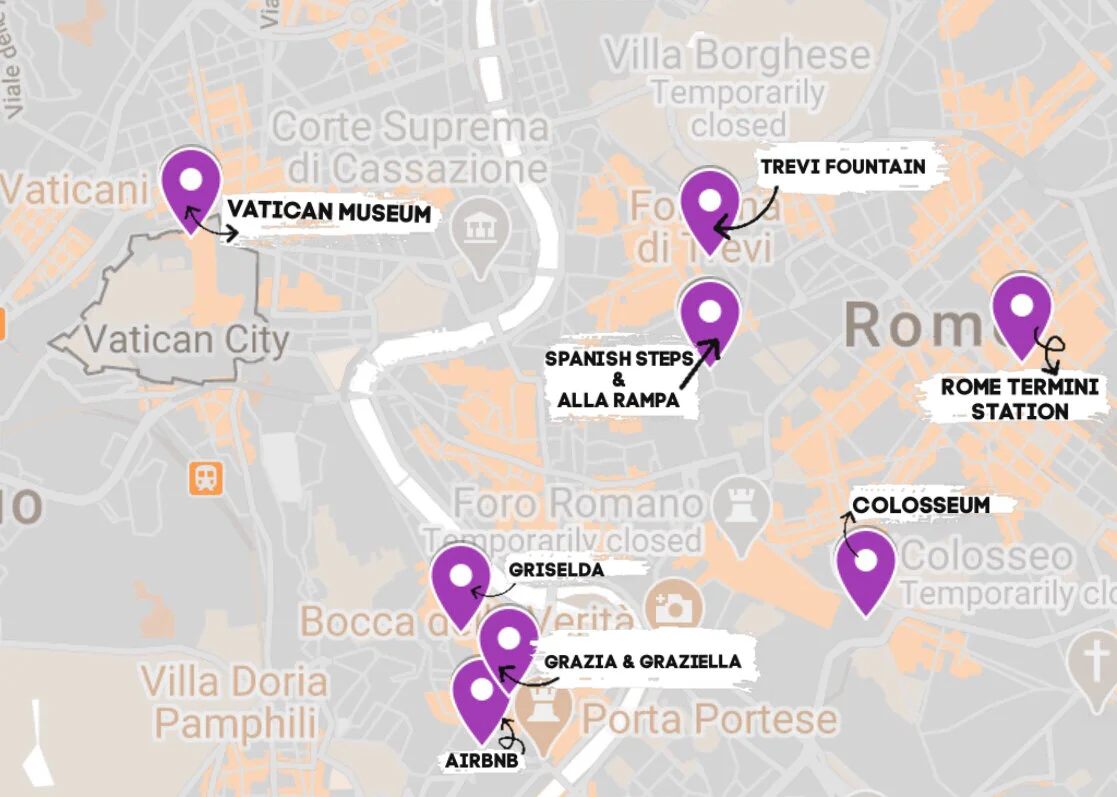 Rome is one of the coolest places you can go to. It’s full of history and beauty. It’s so cool to see people living in such an ancient city. We landed around midnight and got to our Airbnb in Trastavere soon after landing. We chose to stay in Trastavere because we heard it was the cool, hipster area to stay and it was a little bit cheaper than staying in the center of Rome. It was only about a 25ish minute walk to the center of Rome, so we thought it was the perfect place to start our trip.
